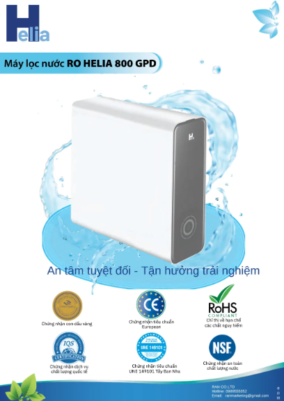 Máy lọc nước Helia RO là sản phầm do Ran CO., Ltd nhập khẩu từ Tây Ban Nha, sản xuất theo tiêu chuẩn EU, chất lượng nước đầu ra đạt tiêu chuẩn nước uống trực tiếp QCVN 6-1:2010/BYT của Bộ Y Tế.