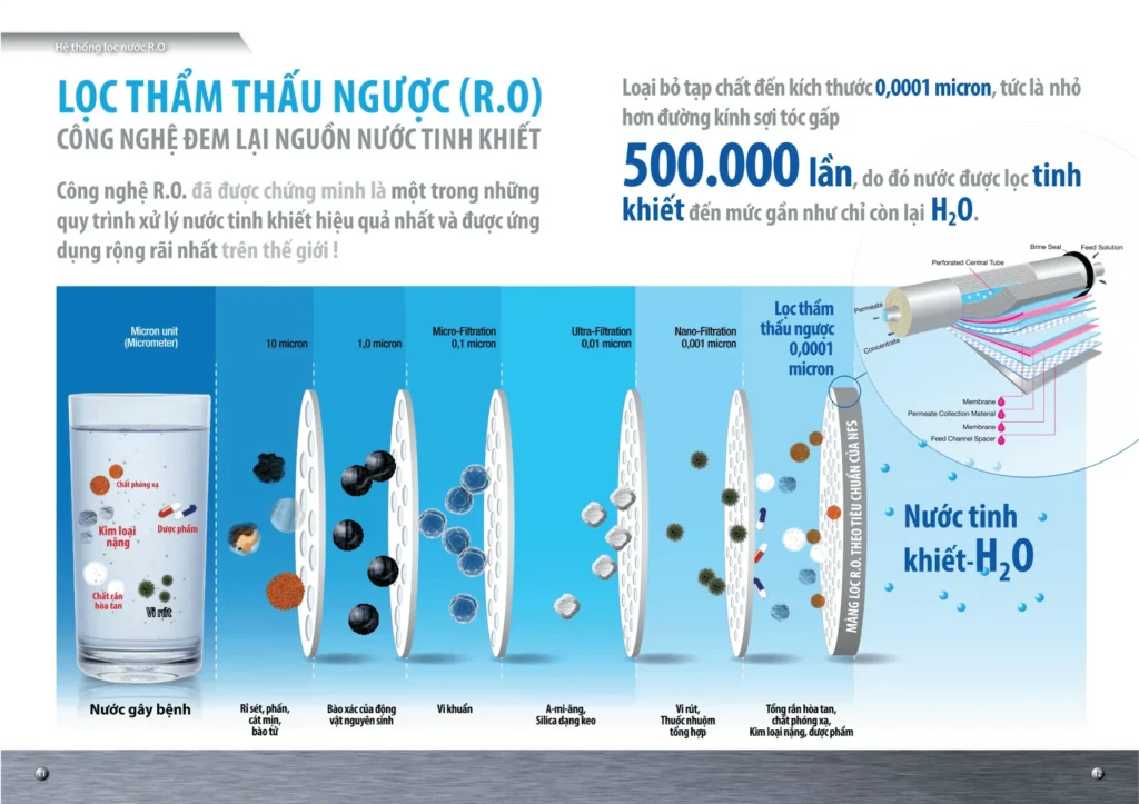 | Khả năng lọc | Loại bỏ 99% vi khuẩn, virus, kim loại nặng, các chất hòa tan | Loại bỏ vi khuẩn nhưng không loại bỏ được muối và các chất hòa tan nhỏ | Loại bỏ hầu hết vi khuẩn và một số ion kim loại, giữ lại chất khoáng |
